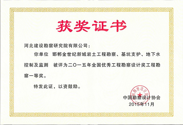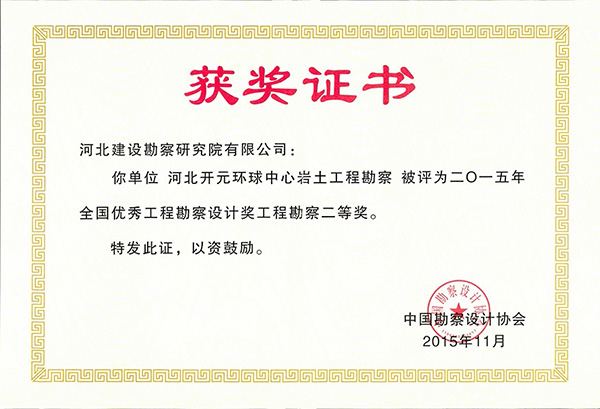 近日,公司兩項工程分別榮獲2015年度全國優(yōu)秀工程勘察設(shè)計工程勘察一、二等獎.一等獎:邯鄲金世紀(jì)新城巖土工程勘察、基坑支護(hù)、地下水控制及監(jiān)測;二等獎:河北開元環(huán)球中心巖土工程勘察。