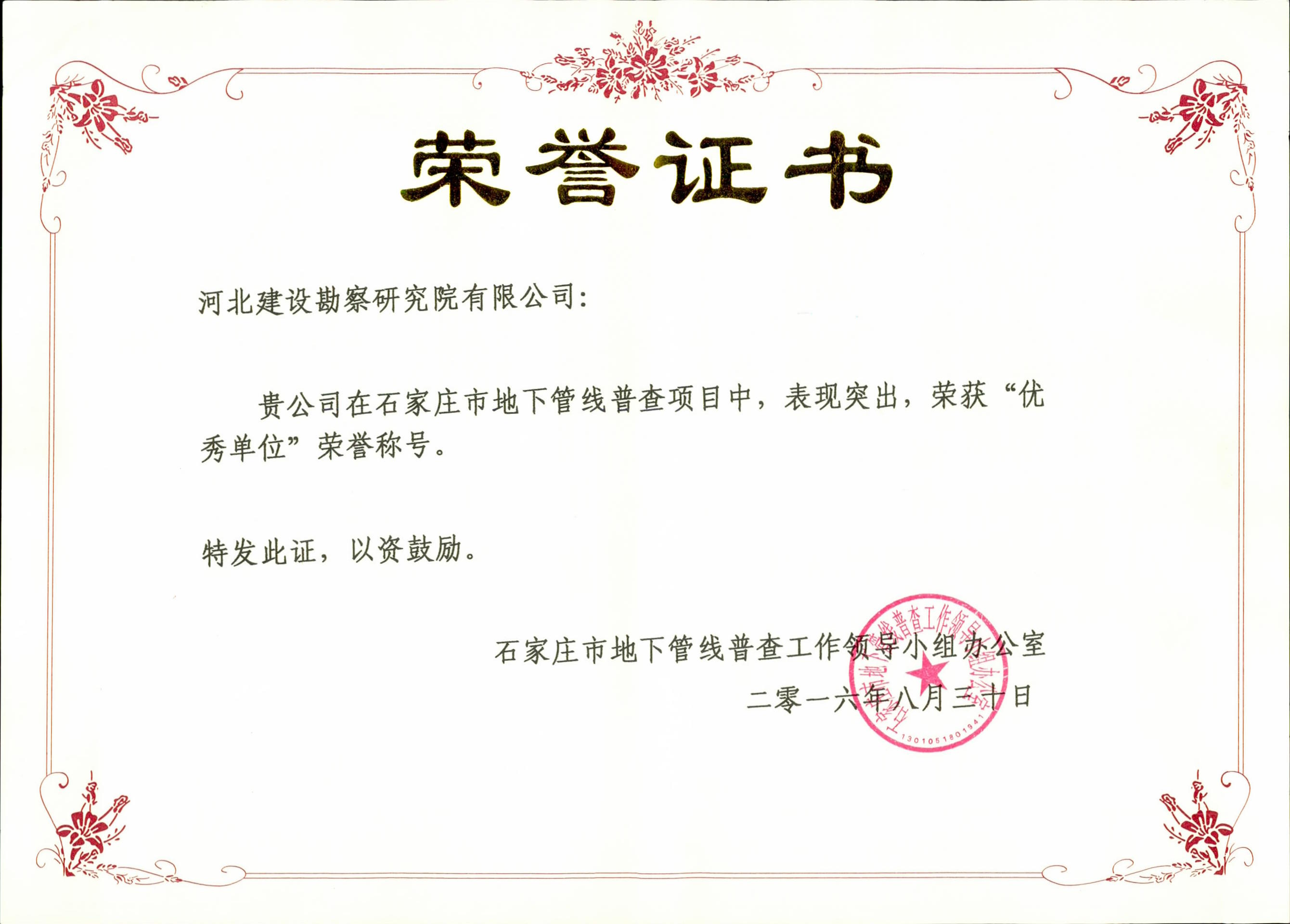 公司承擔(dān)的石家莊市地下管線普查項(xiàng)目于近日完工,并順利通過石家莊市地下管線普查工作領(lǐng)導(dǎo)小組檢查。石家莊市地下管線普查工作領(lǐng)導(dǎo)小組充分肯定了我公司在該項(xiàng)目中取得的成績和突出的表現(xiàn),特頒發(fā)“優(yōu)秀單位”榮譽(yù)證書,以資鼓勵。