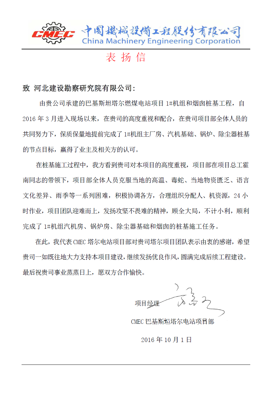 由我公司承建的巴基斯坦塔爾燃煤電站項目1#機組和煙囪樁基工程和巴基斯坦Tenaga49.5MW風電項目,項目部全體人員在項目總工霍南的帶領下,克服工作環境惡劣、生活條件艱苦等一系列困難,積極協調各方,合理組織分配資源,順利完成階段施工任務。近日,總包方中國機械設備工程股份有限公司(CMEC)向我公司發來感謝信,對我公司兩個項目部團隊表示由衷的感謝,并希望我們繼續發揚優良作風,圓滿完成后續工程建設。