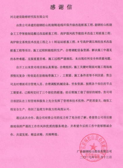 由我公司施工的韶鋼煤氣高效綜合循環(huán)利用改建工程,克服了施工過程中的各項難題,已順利交付三個部位樁基,得到了廣東韶鋼松山股份有限公司的高度認可,特向公司發(fā)來感謝信。