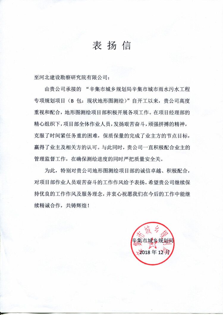 近日,公司收到辛集市城鄉(xiāng)規(guī)劃局和任丘市城鄉(xiāng)規(guī)劃局發(fā)來的表揚信,分別對我公司誠信卓越、積極配合及項目部作業(yè)人員艱苦奮斗的工作作風給予表揚。特別是在任丘地下管線普查項目中,在以蓋忠奎、榮亮為代表的項目部精心組織下,項目全體作業(yè)人員,發(fā)揚艱苦奮斗、頑強拼搏的精神,不斷攻堅克難,保質(zhì)保量提前完成了生產(chǎn)任務,贏得了業(yè)主的認可。甲方特發(fā)來表揚信,對我公司所作出的貢獻表示感謝!并希望我們繼續(xù)保持優(yōu)良的工作作風及服務理念,精誠合作,共創(chuàng)輝煌!