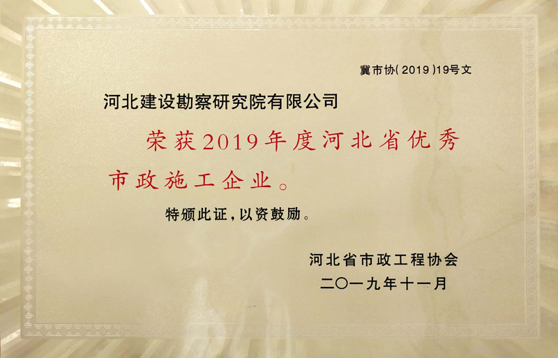 近日公司被河北省市政工程協(xié)會(huì)評為“2019年度河北省優(yōu)秀市政施工企業(yè)”;公司董事長韓立君同志獲評“2019年度河北省優(yōu)秀市政行業(yè)企業(yè)家”。
