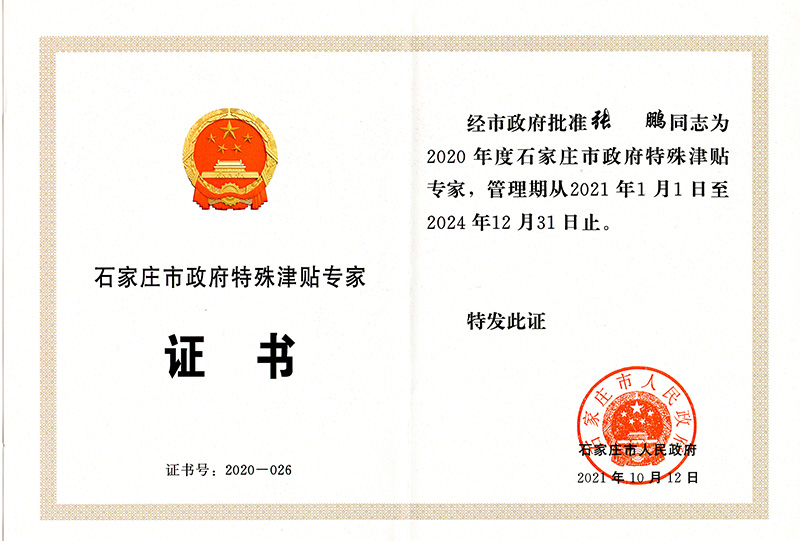 張鵬同志榮獲2020年度石家莊市政府特殊津貼專家稱號