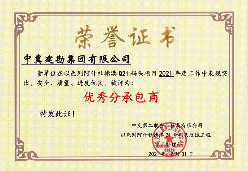 其中,以色列阿什杜德港Q21碼頭項(xiàng)目榮獲“優(yōu)秀分承包商”團(tuán)隊(duì)獎(jiǎng),李五一榮獲“優(yōu)秀項(xiàng)目經(jīng)理”、賀海亮榮獲“SHE管理先進(jìn)個(gè)人”、宋宇峰榮獲“優(yōu)秀質(zhì)量管理先進(jìn)個(gè)人”、張軍鋒榮獲“優(yōu)秀管理先進(jìn)個(gè)人”、李良啟、聶彥科榮獲“優(yōu)秀技術(shù)操作手”、劉宗正榮獲“優(yōu)秀電工”、張秋東榮獲“優(yōu)秀后勤”、趙杰榮獲“優(yōu)秀操作標(biāo)兵”榮譽(yù)稱(chēng)號(hào)。