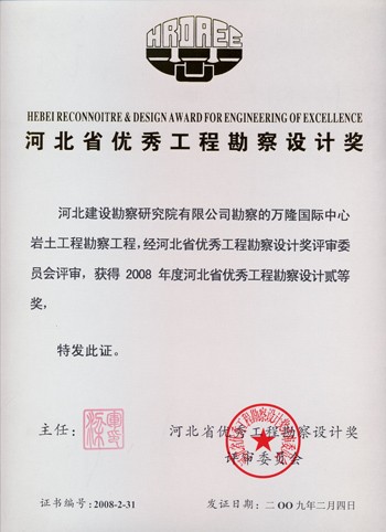 萬隆國際中心巖土工程勘察獲河北省優秀工程勘察設計二等獎。