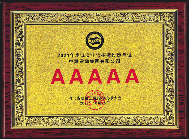近日,我公司被河北省建設工程招標投標協會評為2021年度河北省建設工程招標投標誠實守信5A級施工企業。
