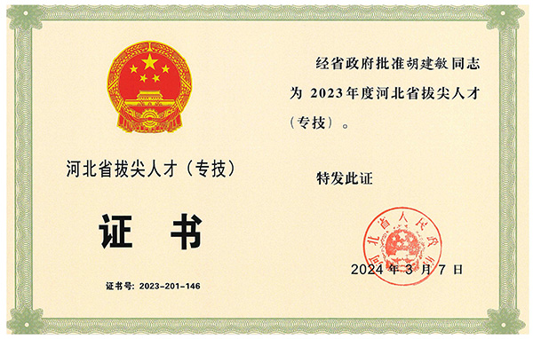 經公司組織申報,石家莊市鹿泉區人民政府、石家莊市人民政府推薦,河北省人力資源和社會保障廳組織評審、答辯,河北省人民政府批準,胡建敏同志榮獲2023年度河北省拔尖人才(專技)。