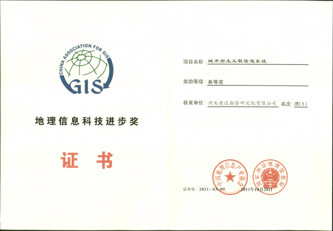 2011年10月25日,2011年度中國地理信息科技進步獎頒獎儀式在北京國際會議中心隆重舉行,經(jīng)中國地理信息產(chǎn)業(yè)協(xié)會、國家測繪地理信息局評選,我公司完成的項目《城市巖土工程信息系統(tǒng)》榮獲2011年度地理信息科技進步三等獎。