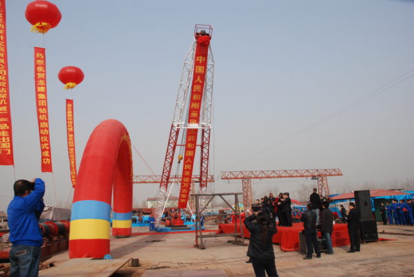 2008年12月9日,在我公司成立55周年的光輝時刻,剛果民主共和國東開賽省總督那茍伊·卡散基閣下,布卡薩先生,賽詩顧問及駐華參贊王維麗女士一行與北京龍建集團總裁楊光烈先生,在我公司梁總經理及鉆探機械廠馬廠長的陪同下,在機械廠南廠區參加了SPS-600鉆機、A18米鉆塔赴剛果施工的啟動暨剪彩儀式。